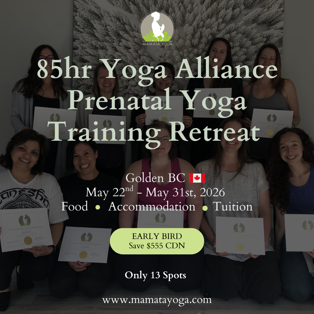 Join 13 other global teachers for this adventurous 85 hr Yoga Alliance Prenatal Yoga Retreat Training Intensive in the stunning Golden, BC Canada from May 22nd - 31st, 2026. This training includes 3 daily meals, shared accommodations and the 85 hr Yoga alliance tuition! If you're craving a training that connects you to nature, like-minded teachers and all things perinatal, check out this retreat! Only 13 spots! Early Bird discount ends May 1st, 2026.